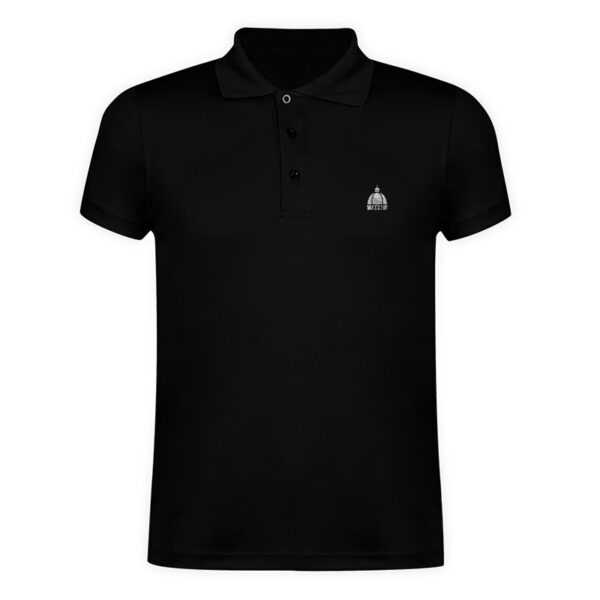 Polo negro de hombre, 100% algodón, con corte moderno y logotipo bordado en blanco de la cúpula de la ETSII en el pecho.