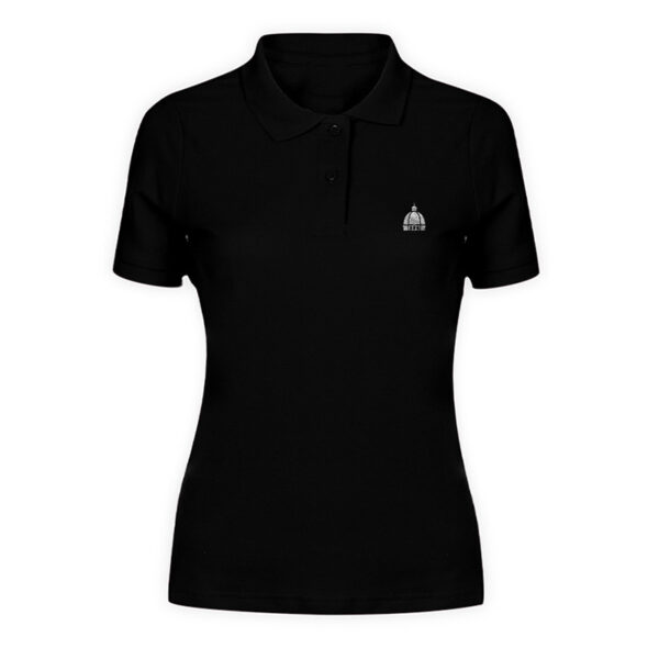 Polo negro de mujer, 100% algodón, con corte moderno y logotipo bordado en blanco de la cúpula de la ETSII en el pecho.